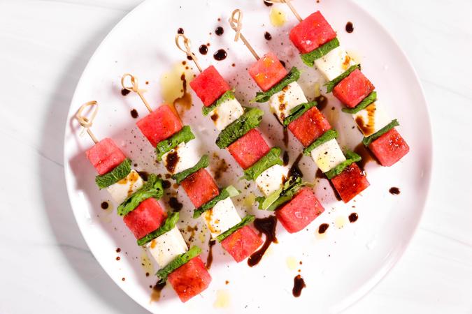 Skip the tomato in this Caprese! Refreshing watermelon meets fresh mozzarella, fragrant basil, and mint in this fun-to-eat recipe.