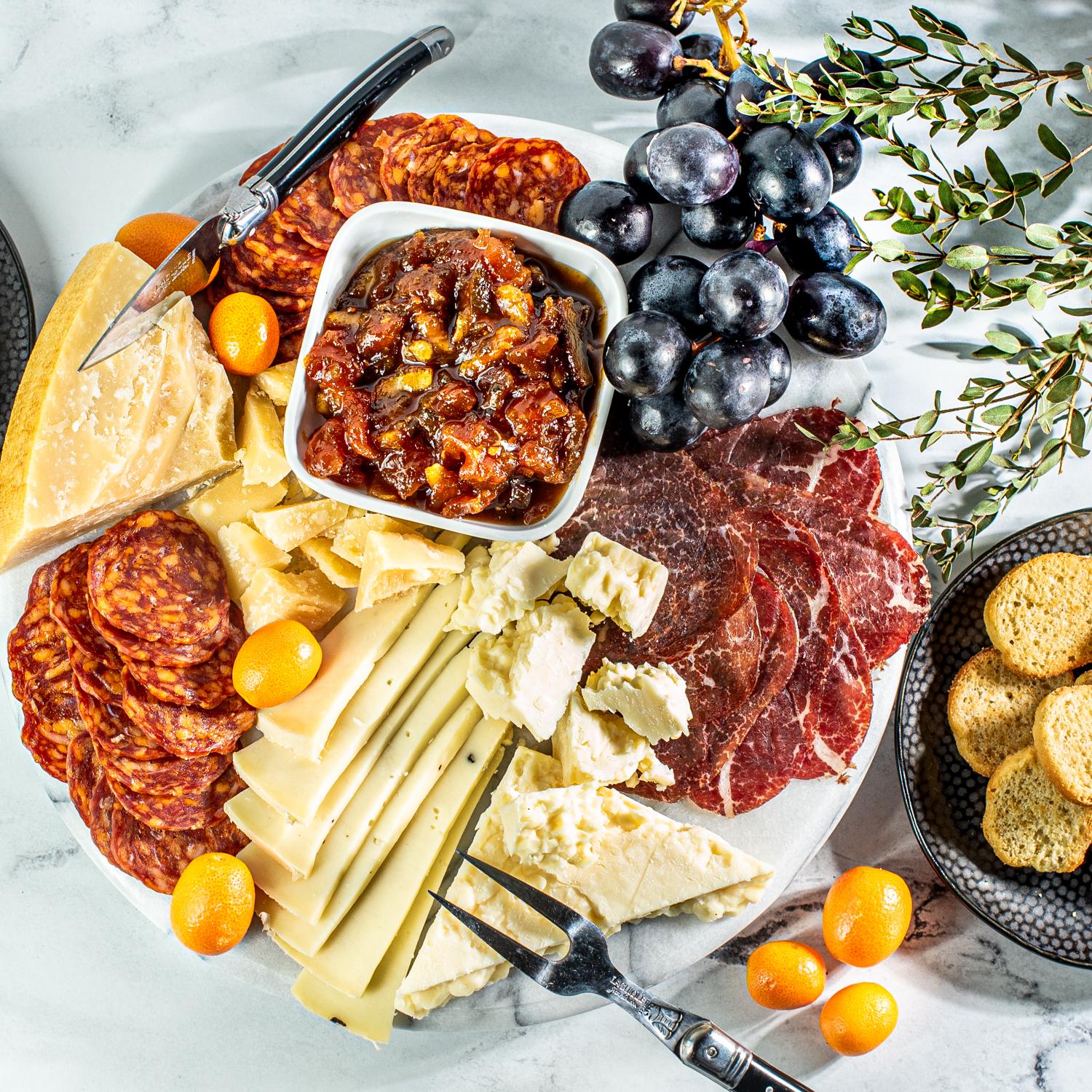 There's no need to grab your passport to enjoy the classic flavors of Italy. The Italian Job Meat and Cheese Board brings together our favorite Italian-inspired cheeses and charcuterie (board and fruit not included). This is a fun way to travel through your taste buds and experience other cultures with great food. Enjoy a rotating selection of Italian and Italian Inspired favorites. See details below.