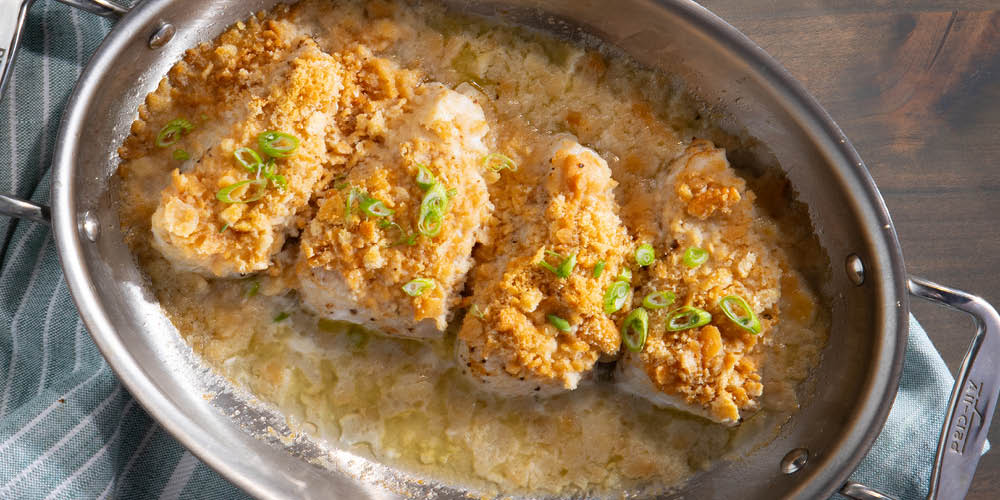 This crispy, golden-brown cod dish is accomplished by a cracker coat, complemented by the addition of lemon juice and butter.