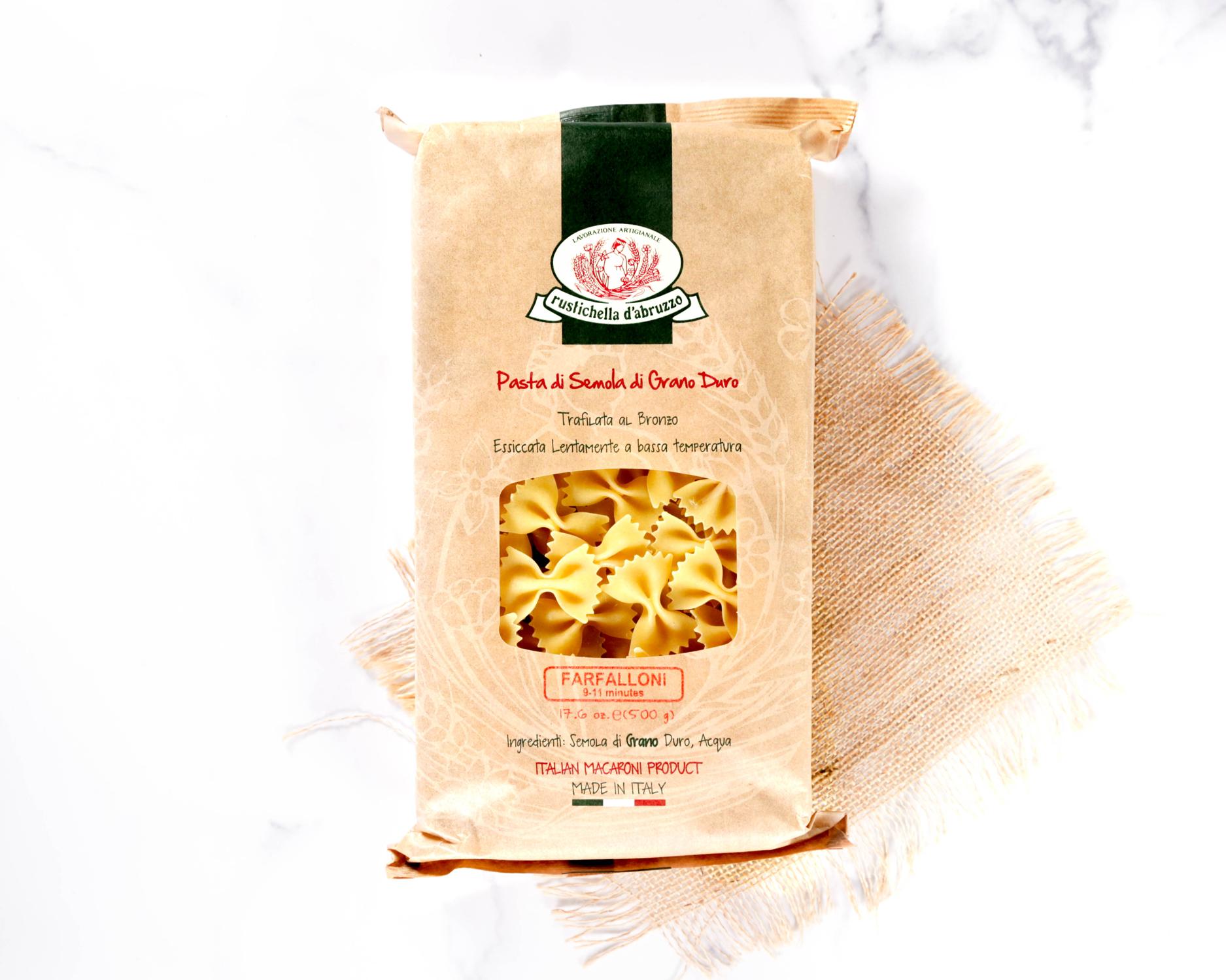 Rustichella d'Abruzzo is made in Italy using only the best semolina flour and spring water. They use traditional bronze dies for extraction and slow drying techniques. Farfalloni (bow tie pasta) is great served with pesto, cheese sauces, or pasta salads. Kids love this shape, too.