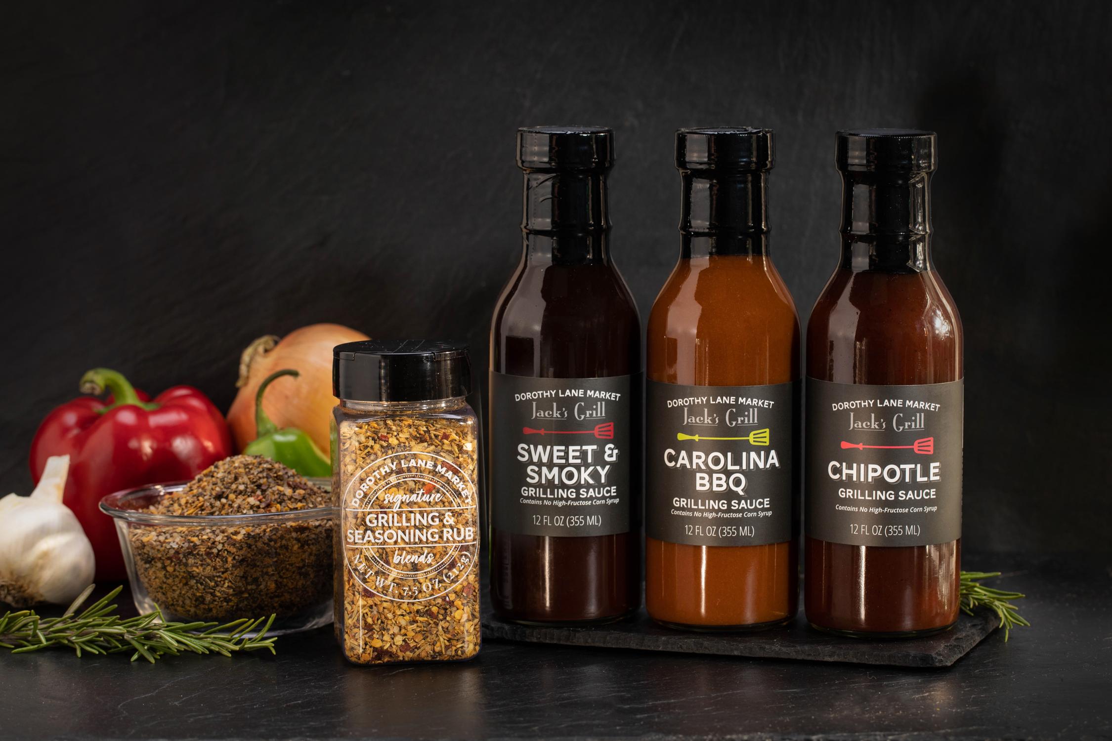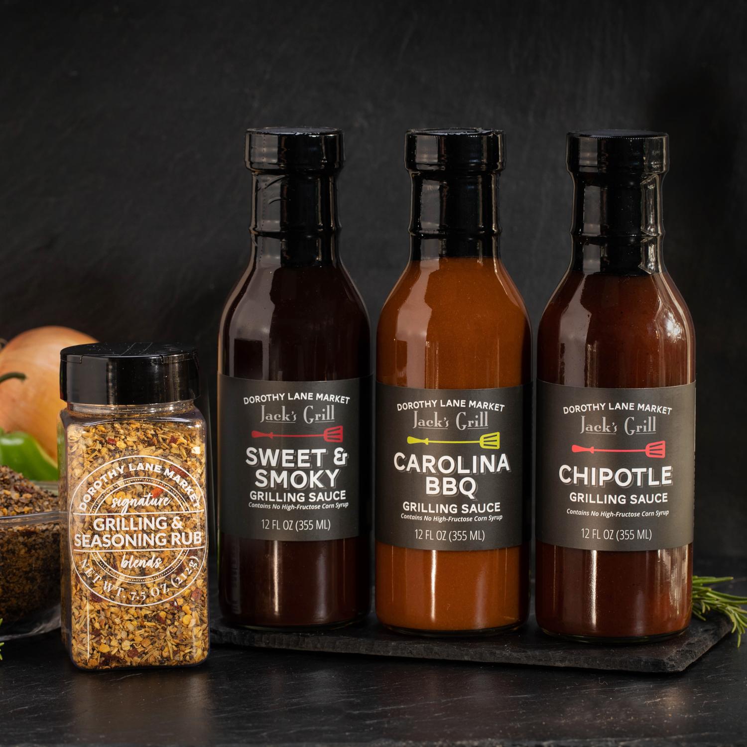 Jack's Grill Sweet & Smoky Grilling Sauce: All-natural Sweet & Smoky Grill Sauce is spicy, yet piquant, with just enough smoke to marry beautifully with tender pork, moist chicken, or even shellfish.